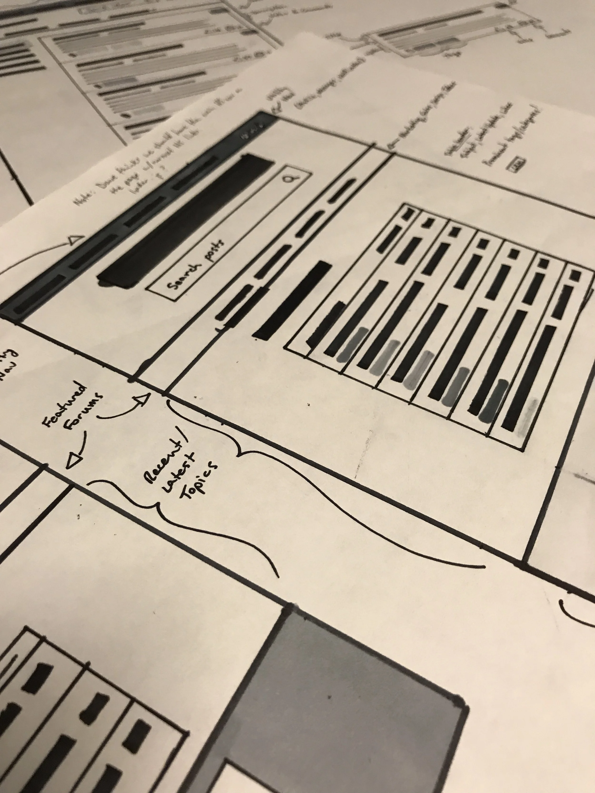 In order to conceptualize the layout of the primary pages of the Community, we created low-fidelity wireframes to get a feel for where the content should go. After weighing the pros and cons of a few different wireframes, we decided on the sketches seen in the screenshot to the leftfor the overall layout. This aligned well with the goals of the users and the stakeholders as it attempted to switch the emphasis from creating new posts to searching first.